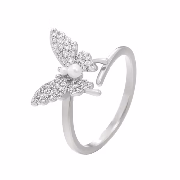 Låt en glittrande fjäril slå sig ner på ditt finger! Den här skimrande ringen i silverfärgad koppar är dekorerad med en detaljrik fjäril av strass och en liten pärla. Elegant, drömmig och justerbar – perfekt både till vardag och fest.