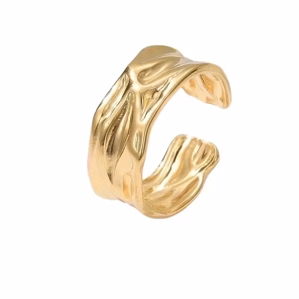 En ring som fångar blicken – skulpterad, blank och med en organisk känsla som gör varje exemplar unikt. Den gyllene ytan skiner vackert och ger en självsäker touch till varje outfit.