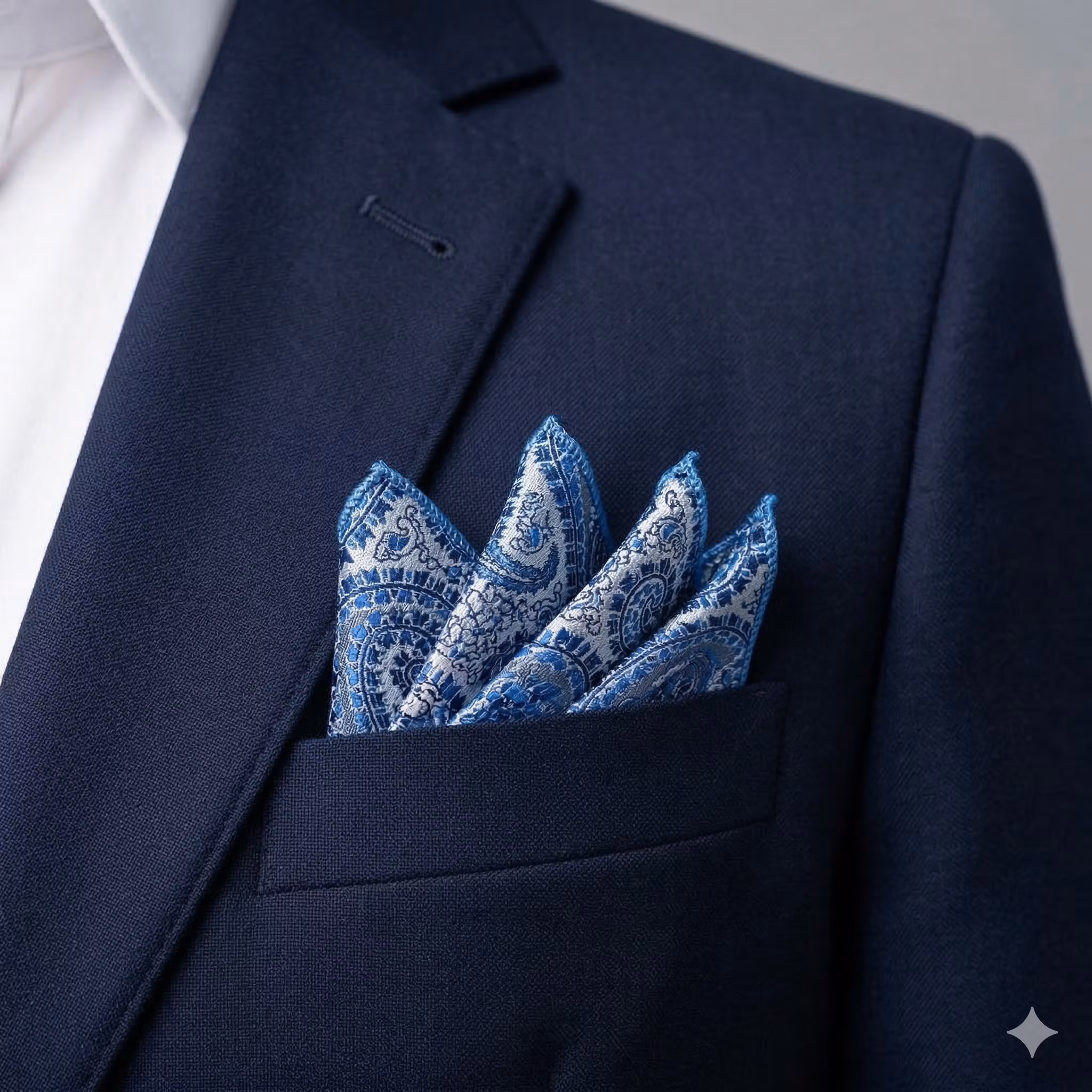 Ge din kavaj en tidlös och sofistikerad karaktär med denna eleganta bröstnäsduk i blå toner. Designen pryds av ett klassiskt paisleymönster där olika nyanser av blått och silver samspelar i en detaljrik komposition. Tack vare satinväven får ytan en vacker lyster som reflekterar ljuset och ger din outfit en välpolerad finish, oavsett om det är till bröllop, fest eller en dag på kontoret.