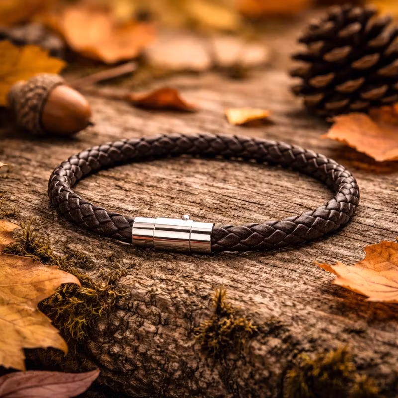 Ett stilrent herrarmband i flätat läder med en djup kaffebrun färgton som ger ett klassiskt och maskulint uttryck. Den flätade strukturen skapar en diskret textur som gör armbandet levande samtidigt som designen förblir enkel och tidlös.