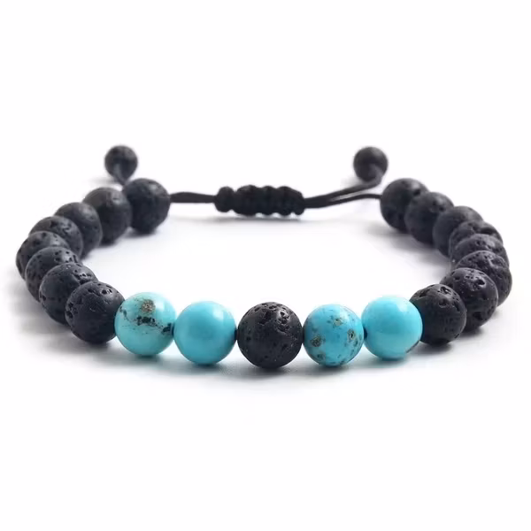 Lavasten symboliserar jordning och styrka, medan turkos ofta associeras med skydd och positiv energi – perfekt kombination för balans och uttryck.