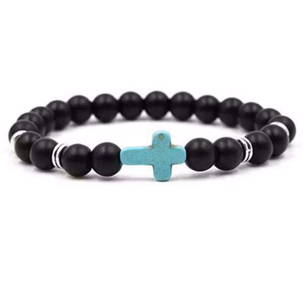 Ett stilrent armband med kraftfullt uttryck. De mattsvarta stenarna ger ett sobert intryck, medan det turkosa korset skapar en iögonfallande kontrast som drar blickarna till sig. Perfekt både som personlig symbol och som en snygg accessoar till vardags eller fest. Elastiskt och enkelt att ta på – bär det som en påminnelse, en statement eller bara för att det är snyggt.