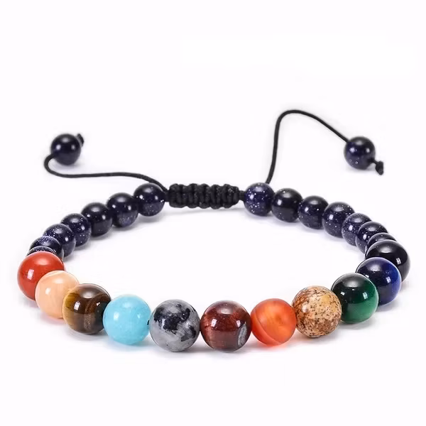 Färgstarkt, kraftfullt och elegant – detta armband kombinerar 8 mm stora naturstenar i regnbågens färger med mindre svarta pärlor på 6 mm för en tydlig och stilren kontrast. Ett justerbart armband som bär både energi och estetik på handleden.