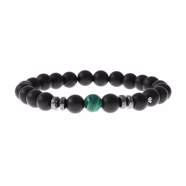 Elegant och kraftfullt med en touch av färg – detta elastiska armband kombinerar mattsvarta stenar med en djupgrön natursten i mitten. En diskret men uttrycksfull detalj för varje outfit.