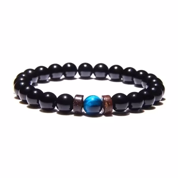 Ett kraftfullt och stilrent armband där matt svarta pärlor möter en intensivt blå tigeröga-sten som fångar ljuset på ett unikt sätt. Den djupa kontrasten mellan svart och blått gör armbandet lika snyggt till vardags som till en uppklädd look. Elastisk tråd ger en bekväm passform som smidigt följer handleden hela dagen. Ett armband för dig som vill bära något både sobert och iögonfallande.