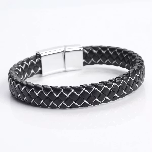 Ett armband med attityd. Det flätade svarta PU-lädret får extra edge av de silverfärgade trådarna, och det rostfria magnetlåset håller allt på plats med både kraft och stil.