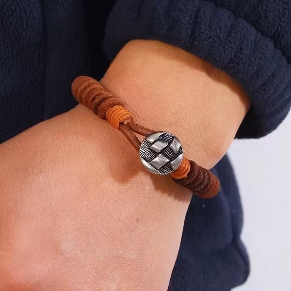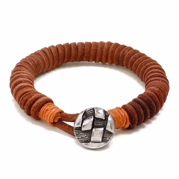 Ett karaktärsfullt herrarmband med en touch av vintage. Den rustika knapplåset, tillsammans med tätt lindade PU-läderringar, skapar en design som känns både tidlös och originell. Perfekt för dig som gillar hantverkskänsla och vill bära något som sticker ut – utan att bli skrikigt.