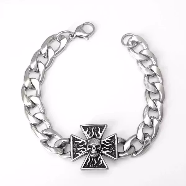 Rå energi möter symbolik i det här kraftfulla herrarmbandet. Det korsformade smycket i mitten bär en flammande dödskalle – som om elden själv sprakar genom stålet. En perfekt accessoar för dig som gillar att ta plats och visa vem du är.