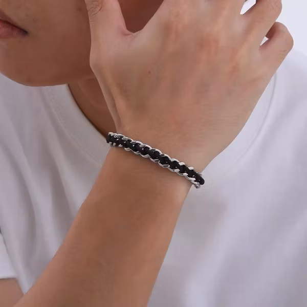 Stilrent, bekvämt och med attityd – detta armband kombinerar en flätad textiltråd med en länk i blankt rostfritt stål. En kontrast mellan mjukt och hårt som ger ett tidlöst uttryck. Perfekt både till vardag och till fest.