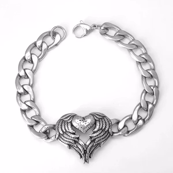 Ett kraftfullt armband med ett lika mjukt som mäktigt budskap. Det detaljrika hjärtat med omslutande vingar symboliserar skydd, trohet och frihet – en perfekt accessoar för dig som bär din styrka nära hjärtat. Kedjan i rostfritt stål förstärker den maskulina känslan och ger armbandet en tydlig karaktär.
