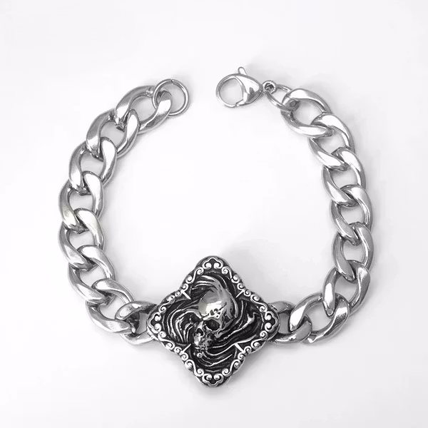 Maskulint, rebelliskt och med en twist. Det här länkarmbandet i rostfritt stål bär ett intrikat dödskallemotiv med snirkliga detaljer – perfekt för dig som gillar när hård stil möter design. Armbandet är rejält och tungt, men ändå bekvämt att bära till både vardag och kväll.