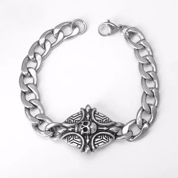 Ett armband för dig som gillar att sticka ut med en kantig, rå stil. De kraftiga länkarna i rostfritt stål ger ett tungt och maskulint uttryck, medan det detaljerade dödskallehänget i legerad metall (alloy) sätter tonen: kompromisslöst och kaxigt. Perfekt för dig som vågar bära ett smycke som syns.