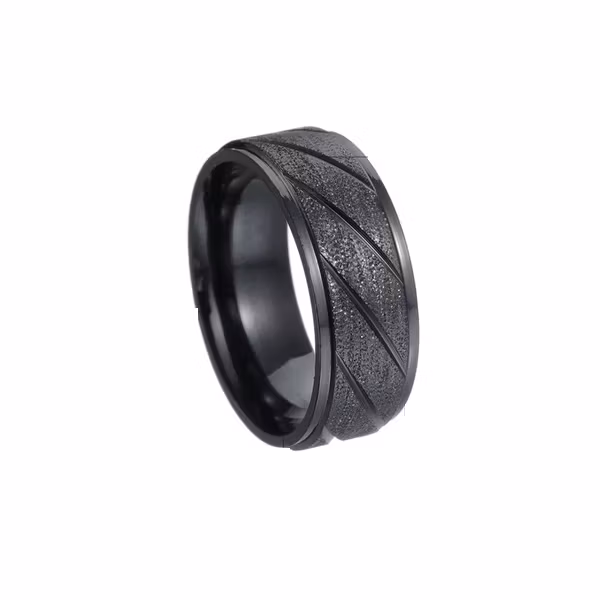En ring med självsäker attityd och modern kant. Den mattsvarta finishen framhäver den strukturerade ytan och de markerade diagonala linjerna ger ringen ett kraftfullt uttryck. Ett smycke för mannen som vill bära något som utstrålar styrka och individualitet.