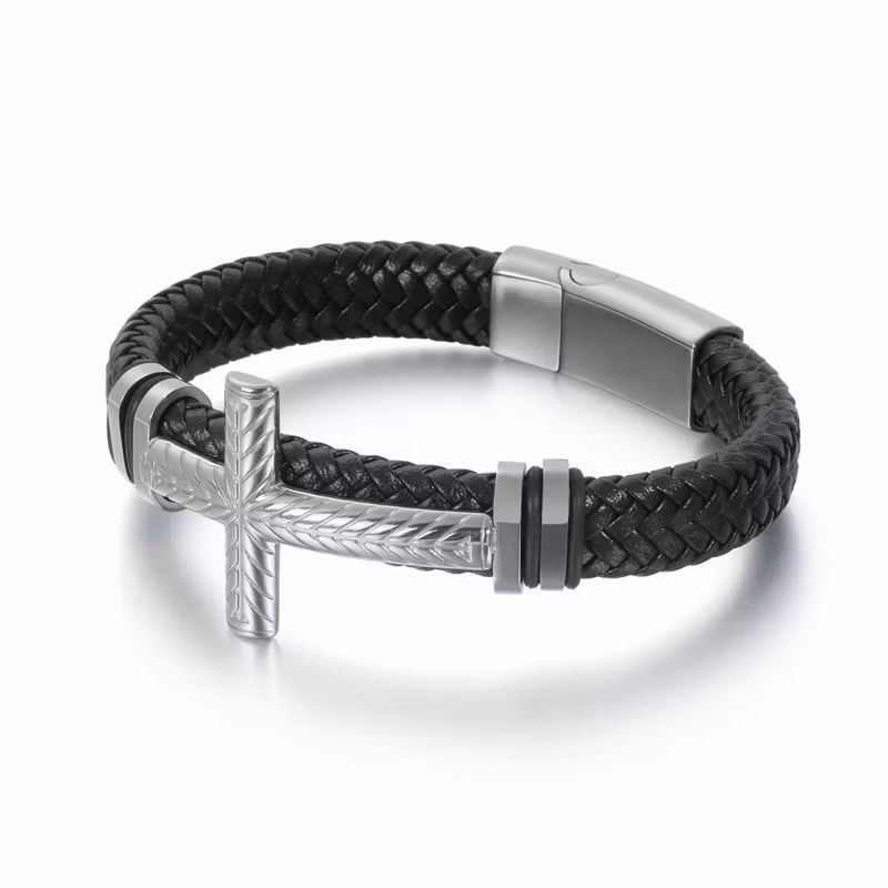 Armband herr kors silver läder 21,5 cm med flätat PU-läder och ett kors i silverfärgad metall. Armbandet har ett magnetlås som gör det enkelt att ta på och av samtidigt som det sitter säkert runt handleden. Korset mäter cirka 29 × 44 mm och ger armbandet en tydlig och stilren symbolisk detalj. Ett herrarmband som kombinerar modern design med en klassisk korssymbol.